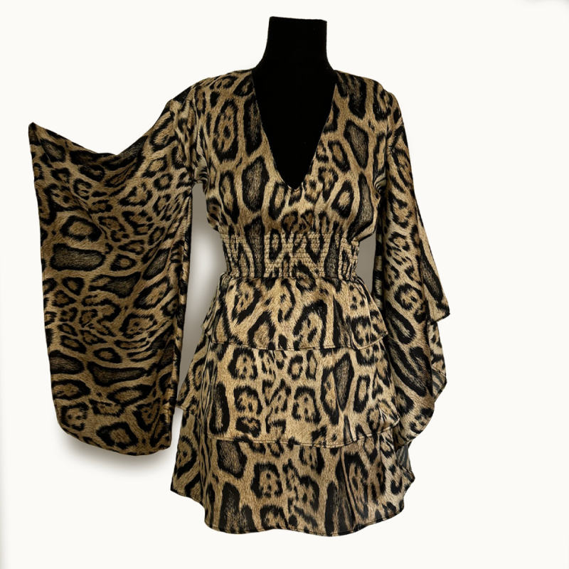 Cette élégante robe léopard est le choix parfait pour toutes les occasions spéciales. Elle présente des manches kimono qui ajoutent une touche de style unique, ainsi que trois volants qui apportent une dose de féminité à votre tenue. La taille est élastique pour plus de confort et d'ajustement. La longueur de la robe est de 83cm.