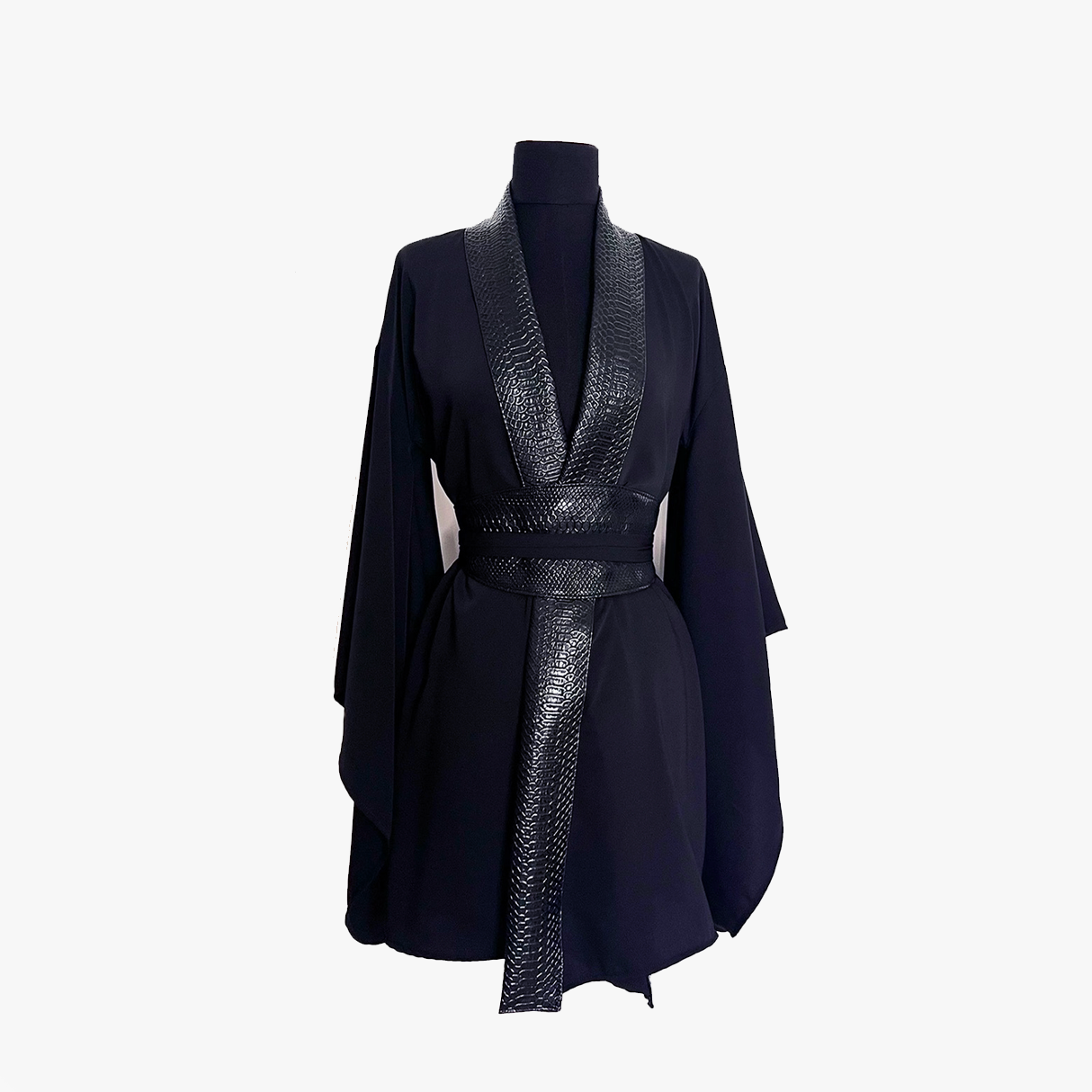 Cette robe kimono allie style et élégance d'une manière exceptionnelle. Son col en simili cuir croco ajoute une touche de glamour, tandis que la ceinture à la taille permet de personnaliser votre tenue pour un ajustement parfait. Cette robe est un incontournable pour les occasions spéciales et les sorties élégantes. Longueur de la robe à partir de l’enmanchure 87cm.